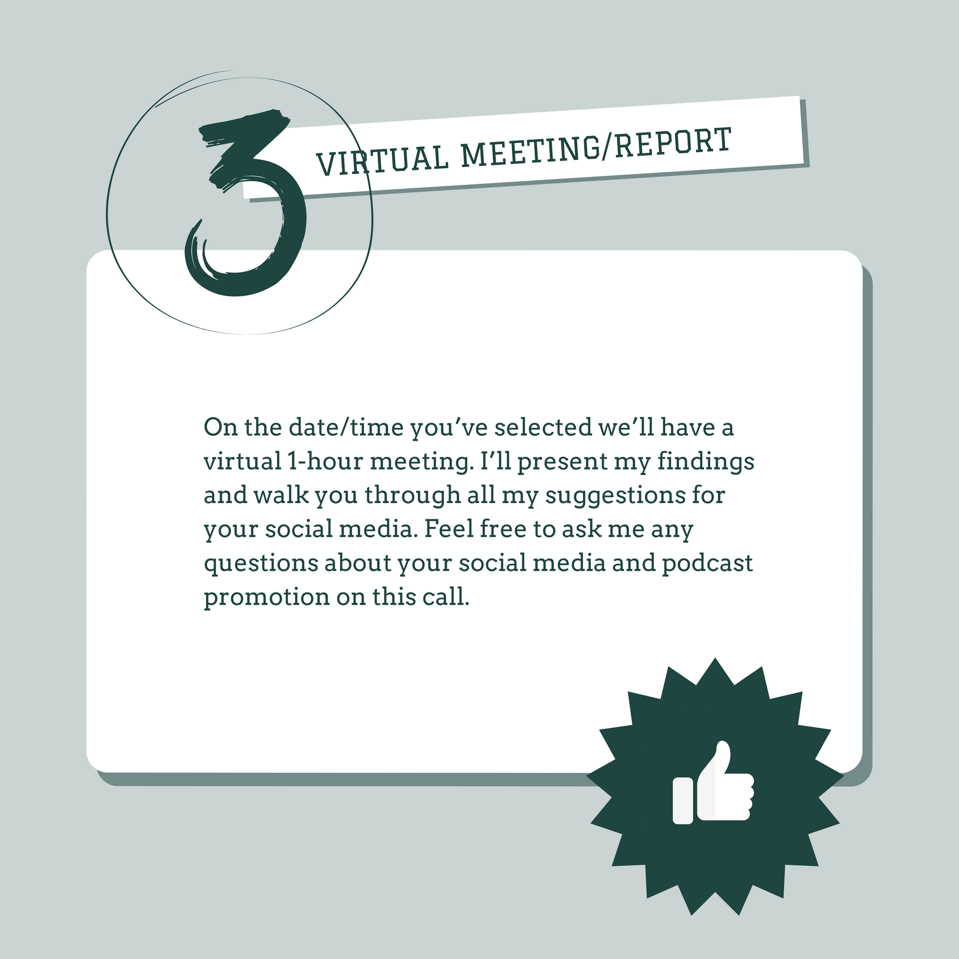 On the date/time you’ve selected we’ll have a virtual 1-hour meeting. I’ll present my findings and walk you through all my suggestions for your social media. Feel free to ask me any questions about your social media and podcast promotion on this call.
