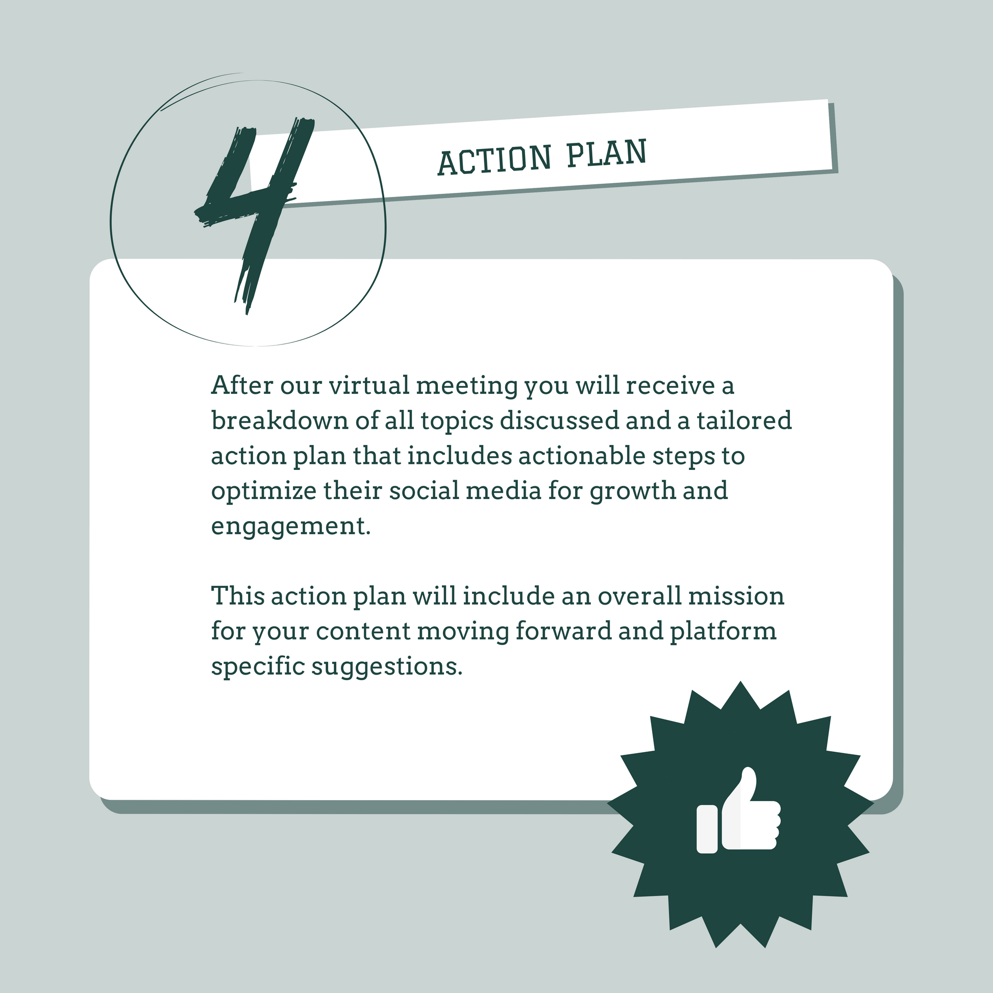 After our virtual meeting you will receive a breakdown of all topics discussed and a tailored action plan that includes actionable steps to optimize their social media for growth and engagement.